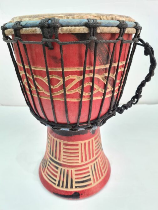 A djembe or jembe is a rope-tuned skin-covered goblet drum played with bare hands, originally from West Africa. According to the Bambara people in Mali, the name of the djembe comes from the saying “Anke djé, anke bé” which translates to “everyone gather together in peace” and defines the drum’s purpose.
