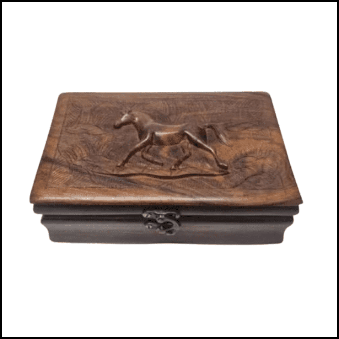 Add a touch of elegance to your collection with this beautifully crafted wooden jewelry box, featuring a stunning elephant design. Made from high-quality wood, this box is perfect for storing rings, earrings, bracelets, and other precious accessories. The intricate detailing and smooth finish make it a timeless piece, blending functionality with artistic charm. Ideal for personal use or as a thoughtful gift for horse lovers and jewelry enthusiasts.