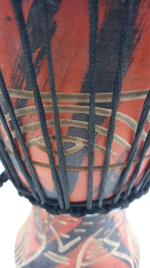 A djembe or jembe is a rope-tuned skin-covered goblet drum played with bare hands, originally from West Africa. According to the Bambara people in Mali, the name of the djembe comes from the saying “Anke djé, anke bé” which translates to “everyone gather together in peace” and defines the drum’s purpose.