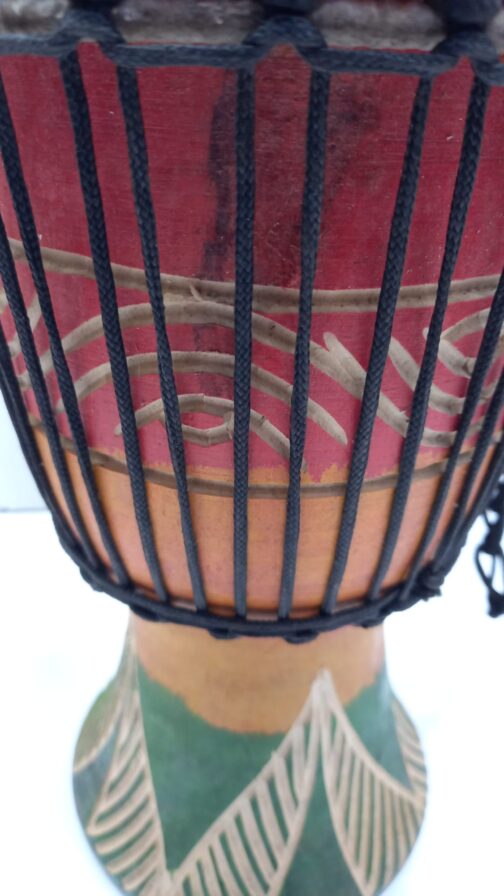 A djembe or jembe is a rope-tuned skin-covered goblet drum played with bare hands, originally from West Africa. According to the Bambara people in Mali, the name of the djembe comes from the saying “Anke djé, anke bé” which translates to “everyone gather together in peace” and defines the drum’s purpose.